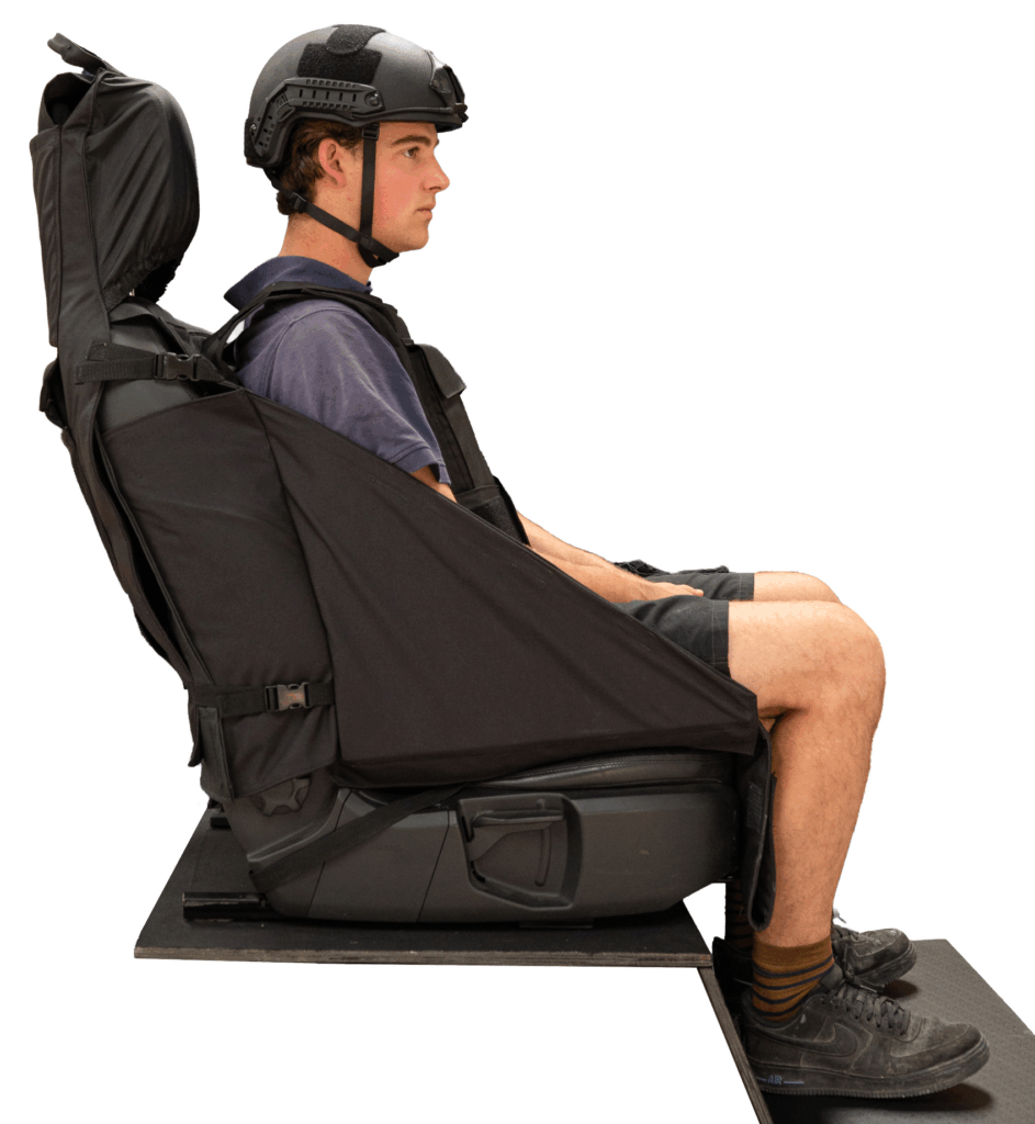 Each cover integrates a fragment‑absorbing seat cushion and back panel. The main cover is secured in seconds using adjustable hook‑and‑loop straps that curve around the seat for a stable fit. A low‑profile front pocket, positioned under the thigh area, provides convenient storage for a phone or sidearm while adding a degree of blast mitigation to items stowed there.
